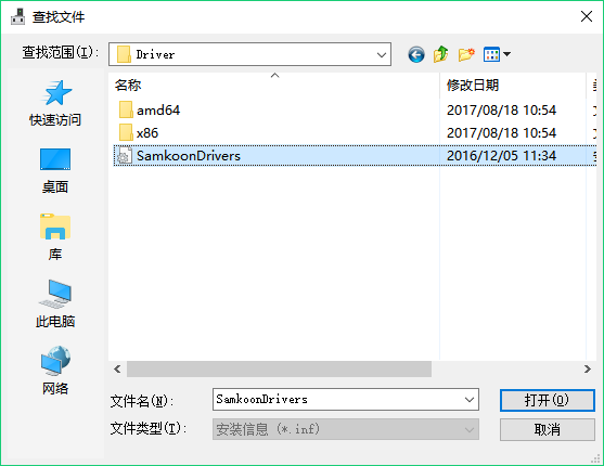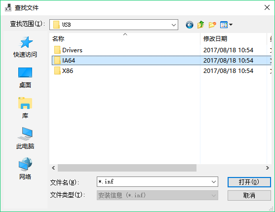 11)选择软件安装目录下的USB文件夹,如:D:\Program Files (x86)\SKTOOL\USB,32位电脑选择X86,64位电脑选择IA64,选中对应文件夹下的“.inf”文件,点击打开(或者直接双击);