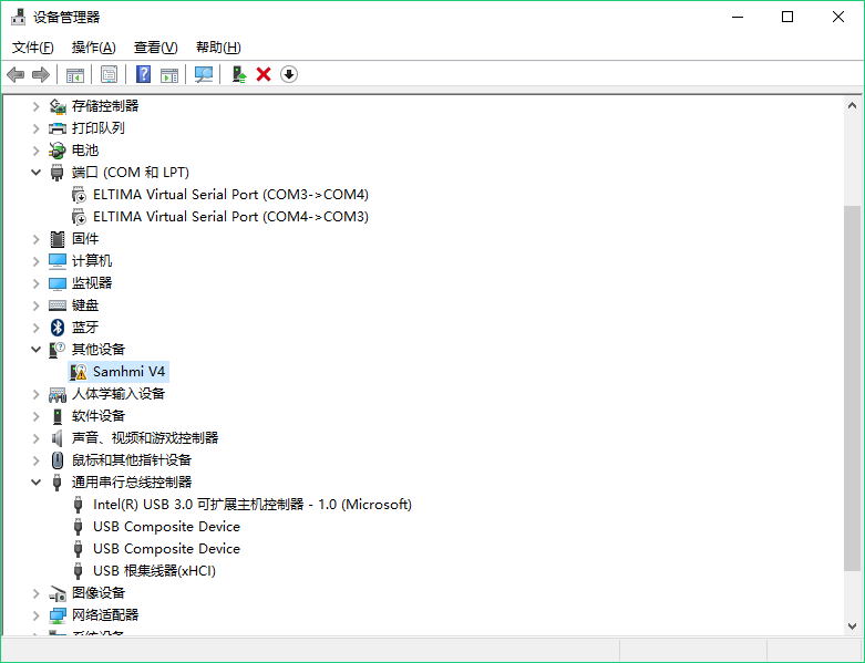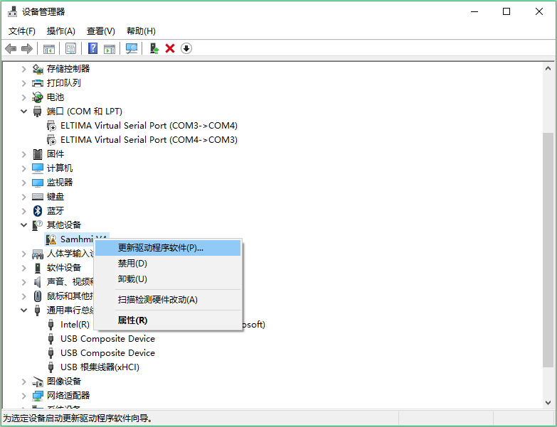 注:如果端口不出现,则将HMI上的USB线拔插几次看看能否识别;如果HMI对应端口的名称为“未知设备”,这种情况下一般不能成功安装驱动,请尝试用如下几种方法解决:1. 看触摸屏是否已经正常启动(如果没有正常启动或者处于黑屏状态,无法安装驱动);2.将HMI上的USB线拔插几次;3. 电脑端换一个USB口;4. 右击该端口,点击卸载,卸载完之后,将USB线拔掉重新插一次;4.换一根USB线;5. 换其他电脑;