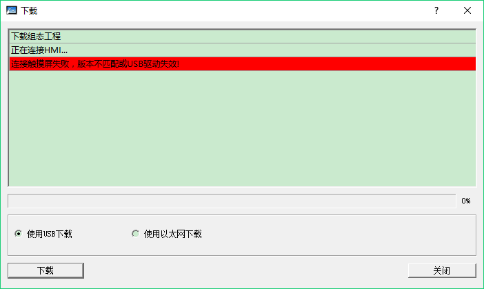 此时驱动名称上带有黄色感叹号,说明驱动文件还没有正确安装;如果此时下载程序会提示“连接触摸屏失败,版本不匹配或USB驱动失效”;